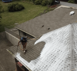 A chlorine-based cleaner mixed with water shocks the algae on your shingles and helps clear debris.